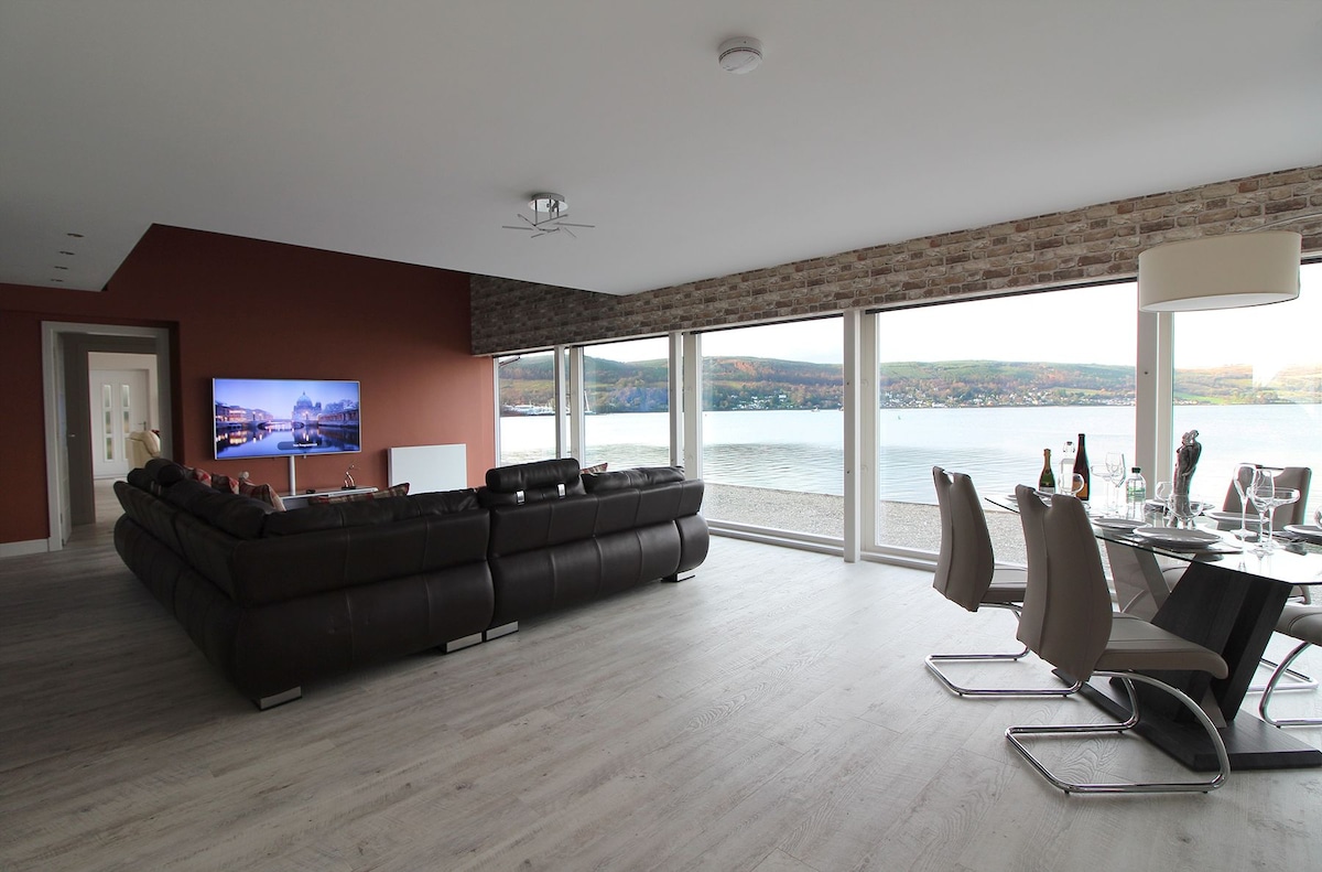 Una casa contemporánea, diseñada y construida por Philip, un verdadero refugio, vistas espectaculares. Mobiliario elegante e interiores relajantes, es el lugar perfecto para una estancia relajante. Un apartamento espacioso, dormitorio con baño y salón privado lleno de interesante arte original, ventanas del suelo al techo que enmarcan vistas inolvidables sobre el estuario del Clyde permanentemente ocupado con tráfico marino. Incluso hay una espaciosa terraza de madera, barbacoa y brasero. Cerca del Parque Nacional del Lago Lomond, Argyle, Dunoon y la costa oeste de Escocia.
