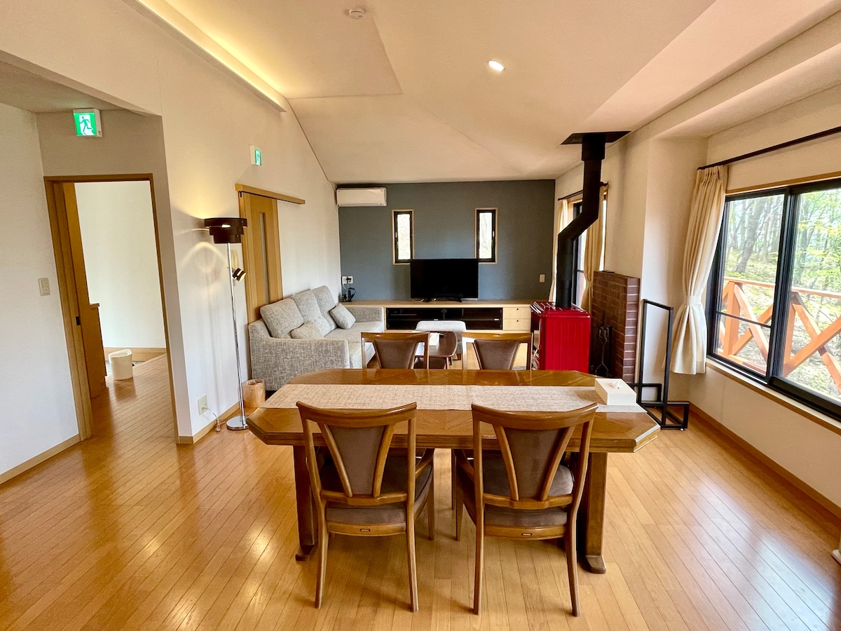 ダイナミックな吹抜けが織りなす開放的なリビング空間。 大きな窓からはやわらかな陽光が差し込み、木々の揺らぎと光の移ろいとともに、心地よい時間が静かに流れます。 冬の愉しみ:パチパチと燃える薪ストーブの火を眺めながら、本物の暖かさに包まれてゆったりとした時間を。 ■夏の快適さ 避暑にも最適な空調設備も完備しており、一年を通じて快適にお過ごしいただけます。 ■観光や滞在に便利な立地 中軽井沢エリア(ハルニレテラス・トンボの湯・地元の有名スーパー ツルヤ)まで車で約5分/旧軽井沢エリア、JR 軽井沢駅まで車で約20分/しなの鉄道 信濃追分駅まで徒歩で約25分と滞在に便利 最大6名様まで宿泊可能です。 ご家族やご友人との大切な軽井沢での時間をお過ごしください。 ※4名様まで同一料金となります。 (4名以上の場合は追加料金が発生いたします) ※薪ストーブ・ベッド有り ※室内・敷地内全面禁煙 ※近隣には素敵なカフェやパン屋さん有り(徒歩圏内)