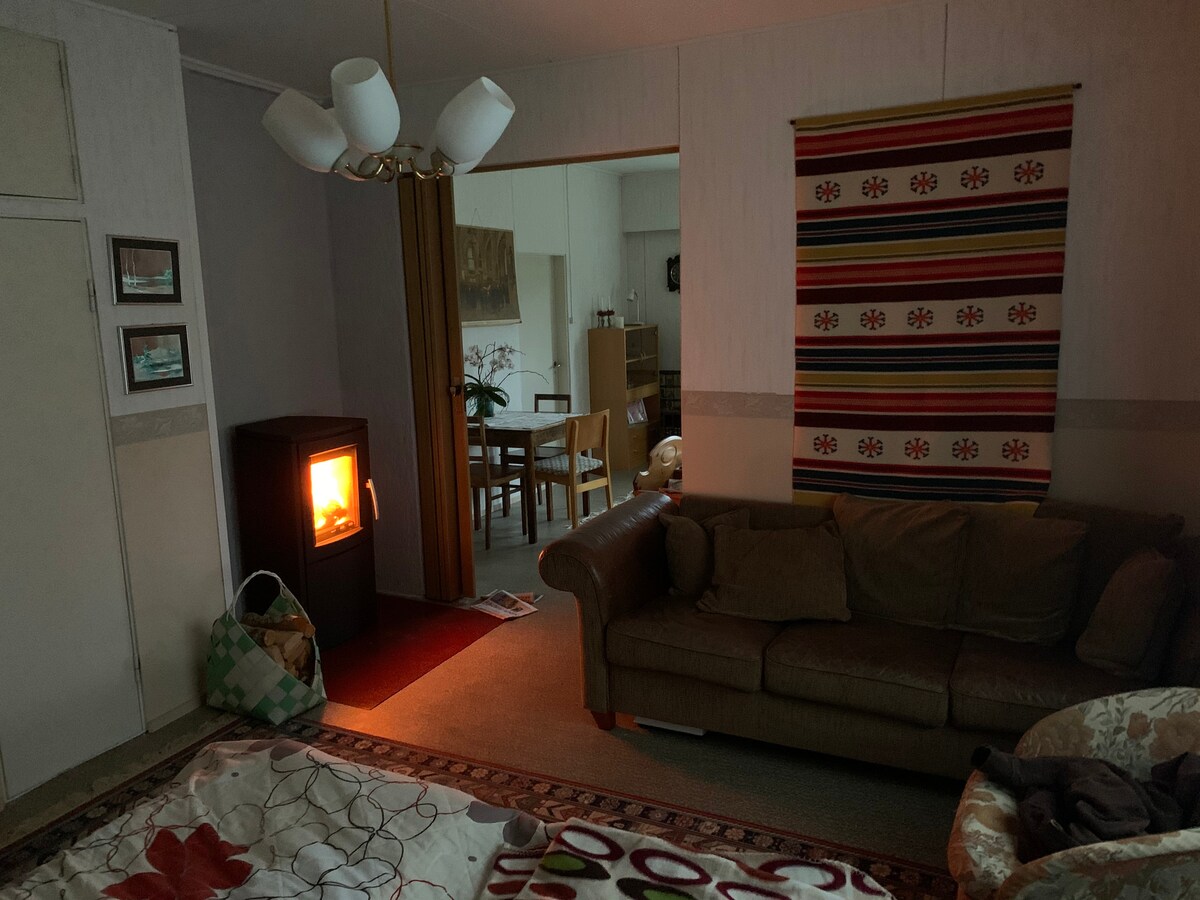 Una casa independiente de dos dormitorios en una zona tranquila para 4 (6) personas. El dormitorio grande tiene dos camas de 80 cm que se pueden combinar en una cama doble. También hay un escritorio en la habitación. El segundo dormitorio tiene una cama de 140 cm de ancho. Un sofá cama en la sala de estar. Se permiten mascotas, sauna de leña, chimenea, bomba de calor de fuente de aire. Caminando a la estación de autobuses 700 m, en el restaurante de la estación Brewe. A la tienda más cercana 550 m. Risto Ryti Hall 800m, búsqueda: risto ryti hall
