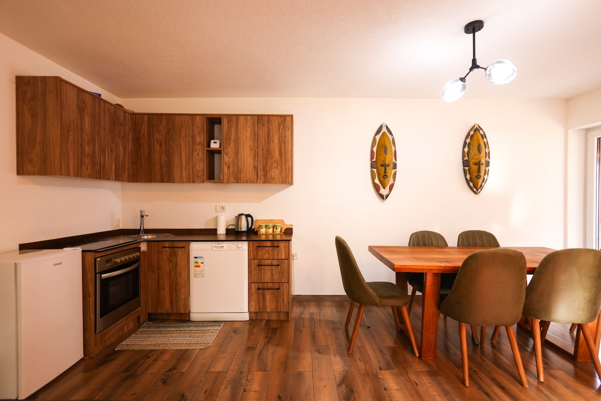 Una muestra cosmopolita del estilo tradicional de la granja albanesa en un apartamento de diseño recientemente renovado en el octavo piso (con ascensor), diseñado con muebles de estilo rural tradicional, artefactos restaurados, espectacular chimenea de mosaico y sofra creado por un artista local. Céntrico pero tranquilo. La pieza central es un comedor de salón/cocina muy espacioso que combina el confort moderno con las características de una oda (la sala clave para socializar en las casas rurales tradicionales albanesas). Anfitriones en inglés, albanés y serbio