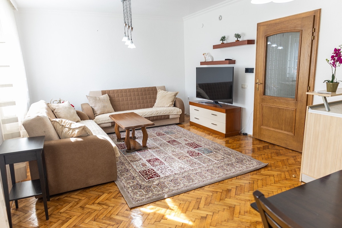 El apartamento tiene capacidad para 5-7 personas y 120 metros cuadrados. El apartamento tiene dos dormitorios grandes y uno más pequeño. Hay una gran sala de estar, una cocina y un baño. Hay dos balcones; uno tiene una vista perfecta sobre Prishtina. El apartamento cuenta con Internet las 24 horas, agua y electricidad, aire acondicionado, sistema de calefacción central y cámaras de vigilancia al aire libre para tu seguridad. El barrio de Aktash es muy tranquilo y encantador, a solo 6-7 minutos del centro de la ciudad. La sede de Kosovo y GIZ está a 2 minutos del apartamento. Hay muchas tiendas de comestibles cerca y restaurantes muy agradables y pequeños bares en el barrio. El apartamento está totalmente equipado con muebles, cuenta con lavavajillas, lavadora y la cocina cuenta con todos los electrodomésticos y accesorios de cocina. El apartamento es para no fumadores, pero tiene dos balcones para el aire fresco y los fumadores. Proporciono: - Ropa de cama - Toallas - Todo el equipo de cocina necesario - Cafetera, incluido un poco de café para tu estancia - Alimentos básicos: aceite de oliva, vinagre, sal y pimienta, azúcar, té - Lavavajillas - Lavadora - WIFI - TV por cable Tenemos un jardín que puedes usar a tu gusto cuando quieras.