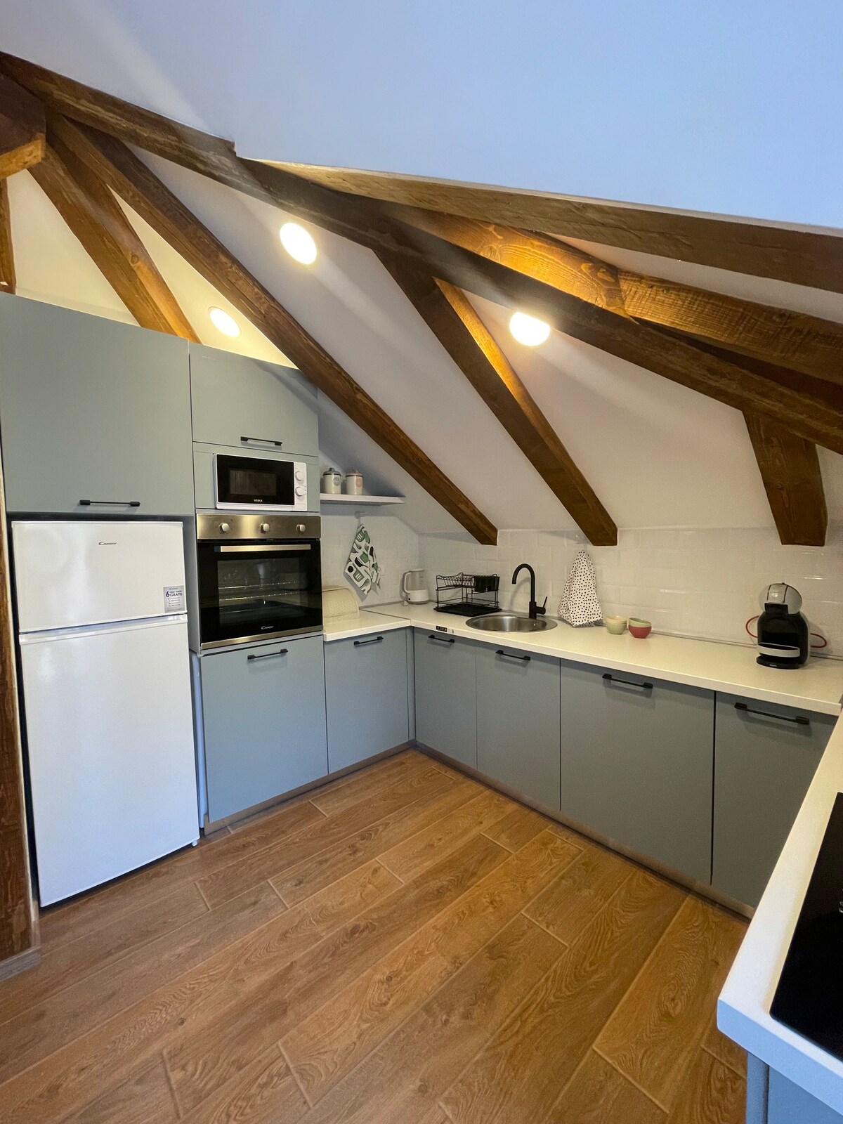 The appartment is located in the attic of the house just across the street from the beach. The appartment is new, equipped with new furniture and gadgets. There are two bedrooms, one with queen sized bed and the other one with single bed. In the living room there is a couch that can be also used as a bed when it "opens up". There is also a dinning table, kitchen, bathroom and a big balcony with a view on both the sea and the mountains.