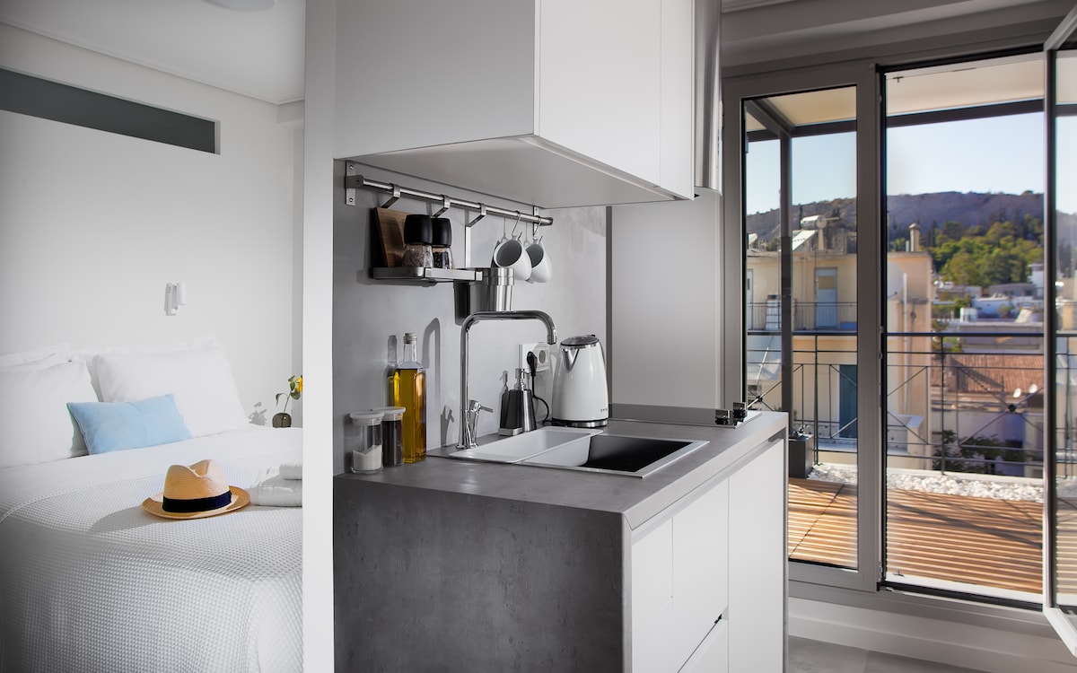 Studio 360 is a new architecturally designed rooftop apartment that offers the perfect city getaway for one or two guests. All fixtures are of highest quality and the rooftop deck provides panoramic views of the main architectural sites of Athens (Acropolis). If you want to feel like you're in a luxury hotel room that is all your own, then this place is for you. The studio is located in the 'hottest' neighborhood of the city center (Koukaki), with shops, eateries and cool cafes/bars nearby.