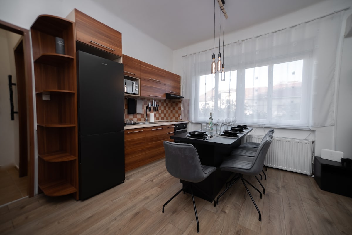 Apartamento recién renovado con estilo, a medio camino entre el centro histórico y las universidades (BTK, ÁOK), a 10 minutos a pie de ambas partes de la ciudad. El ambiente del apartamento es único, hemos intentado integrar cada pequeño detalle en él. Bien equipado, cafetera Nespresso, hervidor de agua, microondas, lavavajillas, secador de pelo para la comodidad de nuestros huéspedes.