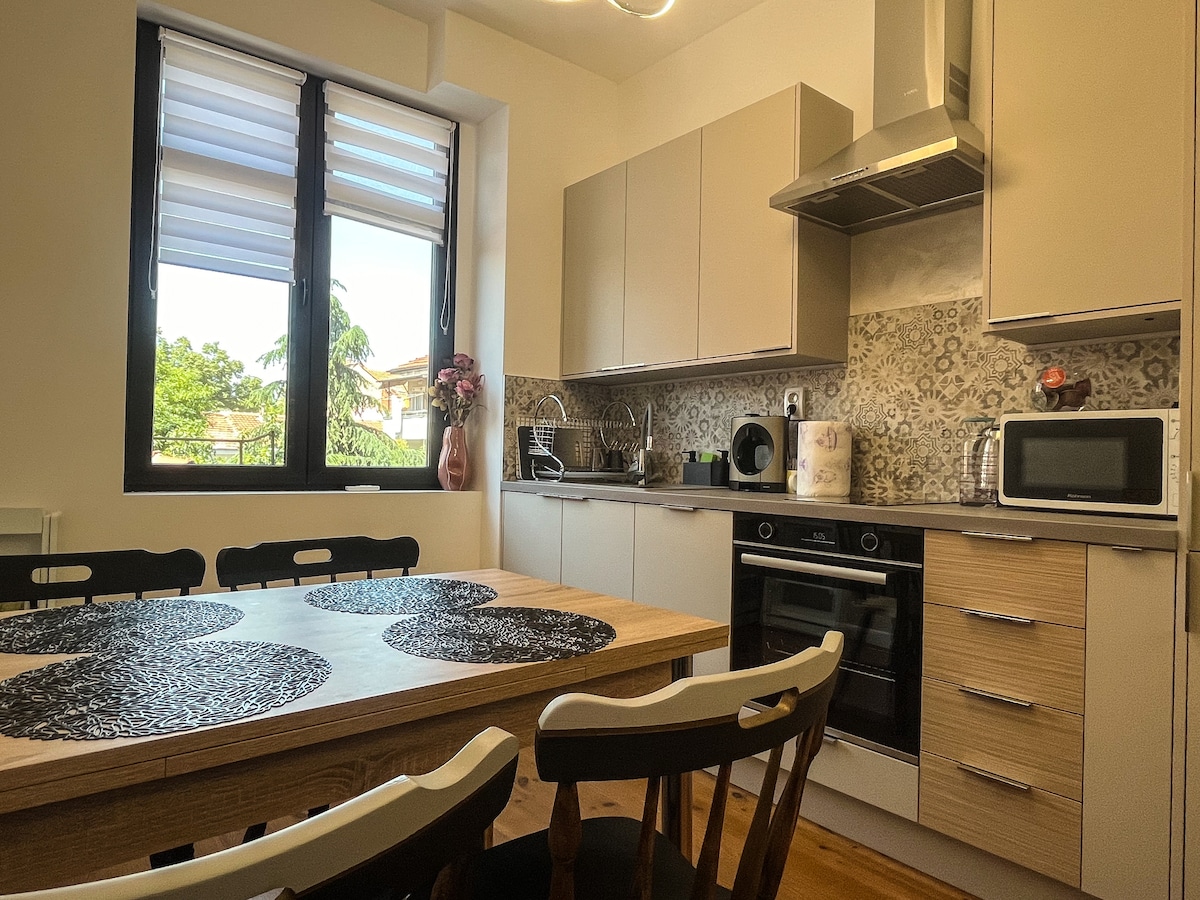 ¡Te damos la bienvenida a tu encantador refugio en Plovdiv! Este elegante apartamento cuenta con un dormitorio sereno, donde las lujosas sábanas y los colores cálidos invitan a un sueño rejuvenecedor. Pisa la acogedora terraza, perfecta para saborear el café de la mañana o los cócteles de la noche. Ubicado en el corazón de Plovdiv, este tranquilo oasis promete una estancia inolvidable.