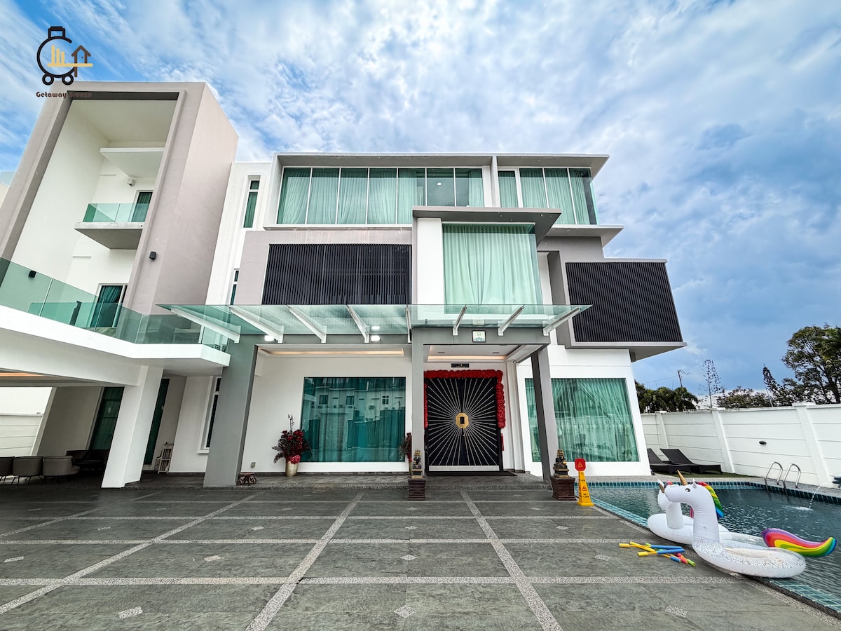 D'Cove, una casa de huéspedes privada de diseño moderno en Kuantan Balok, Malasia. - A poca distancia a pie de la playa de Balok. - Piscina privada con jacuzzi. - Amplia zona de barbacoa. - Capacidad para 15-20 personas. - Cocina. - Cerca de restaurantes de marisco y comida rápida.