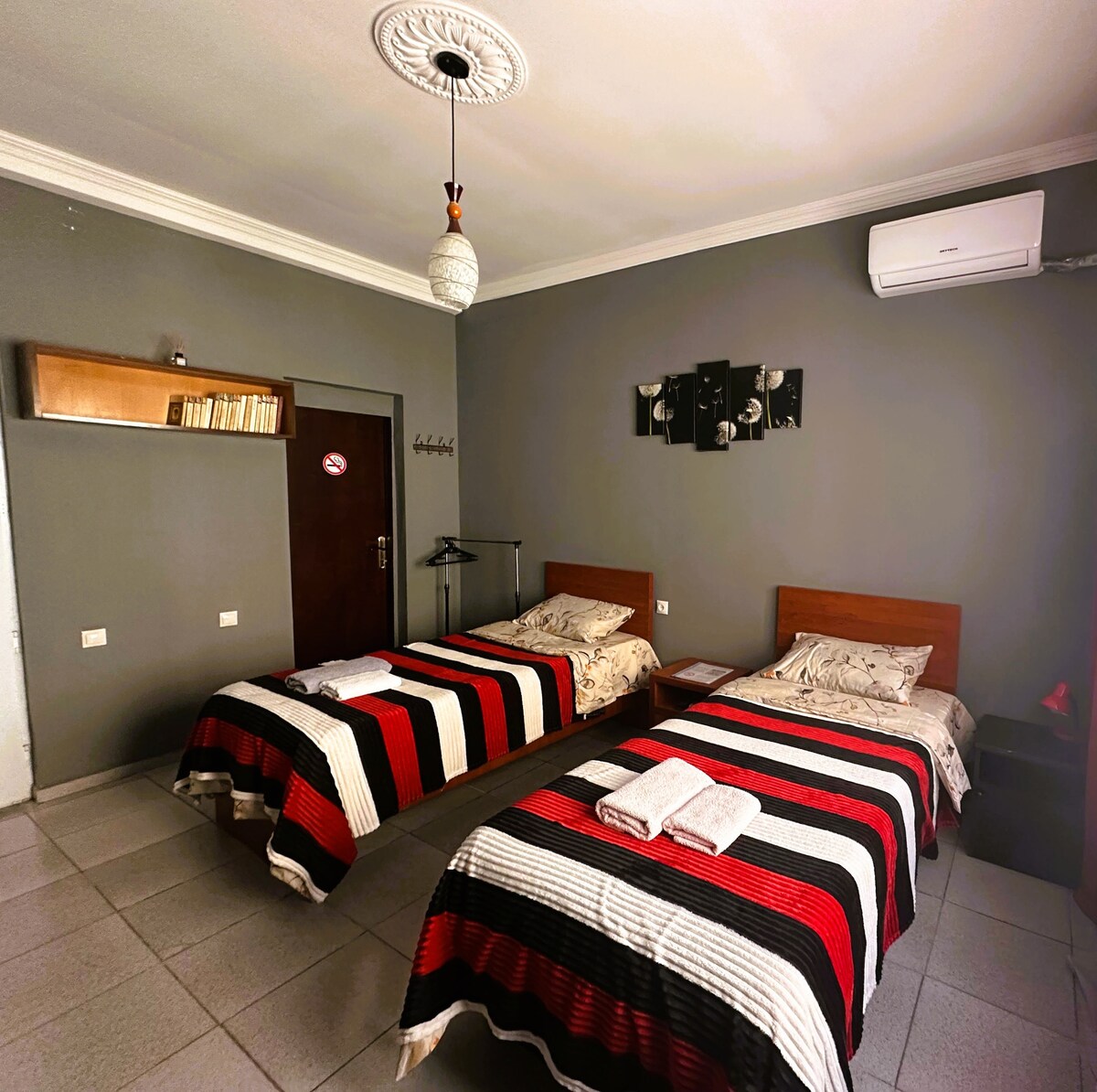 Habitación luminosa con dos camas tamaño queen, ideal para familias pequeñas o grupos de cuatro. Incluye baño privado con ducha a ras de suelo, conexión Wi-Fi gratuita, TV, caja fuerte, mininevera y hervidor eléctrico con café y té. Se proporcionan toallas, sábanas y artículos de tocador. Cocina pequeña compartida y espacio de coworking disponible. Esta habitación da a la parte trasera del edificio. Ubicado en el centro de Vake. Check-in/out sin contacto
