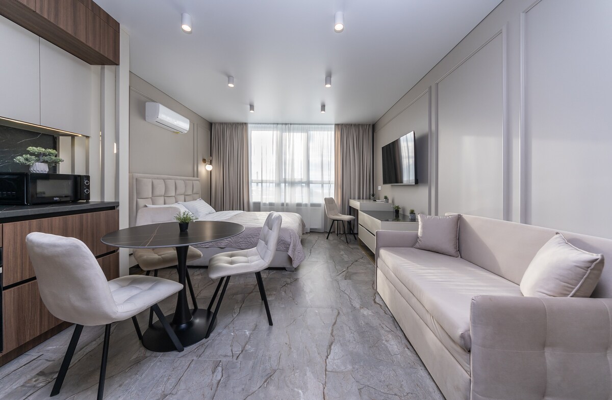 Apartamento nuevo, espacioso, acogedor y muy elegante (LOFT). El apartamento tiene 2 camas de matrimonio y un sofá cama. Casa nueva, aparcamiento gratuito vigilado, parque infantil, estadio. El apartamento está equipado con todos los electrodomésticos necesarios para una estancia cómoda: aire acondicionado, microondas, cocina, horno, lavadora, secador de pelo, plancha, televisores.