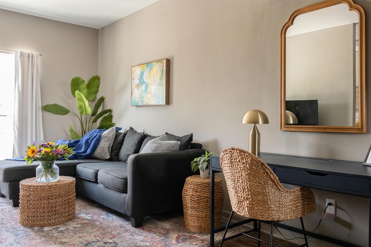 Relájate en una nueva casa adosada «Boho Modern» ubicada en el centro histórico de Bryan y a poca distancia a pie de Ronin, Black Water Draw, RX Pizza, The Village, Cilantro, el mercado de agricultores y muchos más restaurantes. Ambos dormitorios tienen camas tamaño king y la habitación principal/sala de estar tienen televisores de 50 pulgadas. Inicia sesión en tu cuenta personal de streaming o utiliza nuestro Hulu, Disney+ o ESPN+, como cortesía. Relájate en el patio trasero privado o cocina en la hermosa cocina que incluye una cafetera Keurig con cápsulas y cremas.