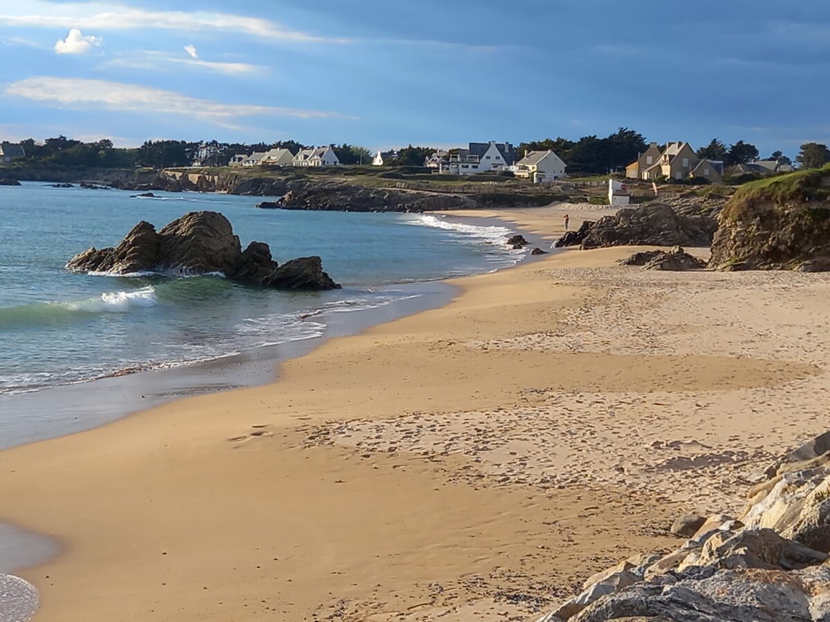 Suite principal de 17 m2 en la planta baja de una casa nueva, en un espacio dedicado de 34 m2 totalmente independiente, ¡casi con los pies en el agua! La playa está a 70 m🏖. En el dormitorio un vestidor y un cuarto de baño ducha a ras de suelo+WC y cocina americana para preparar únicamente sus sándwiches o ensaladas de pícnic. Hay restaurantes cerca). Está a 400 m del centro de la ciudad y del puerto. Embarcadero para las Islas . El castillo de Auvergnac está a 800 m y el sitio de Pen Bron a 6 km.