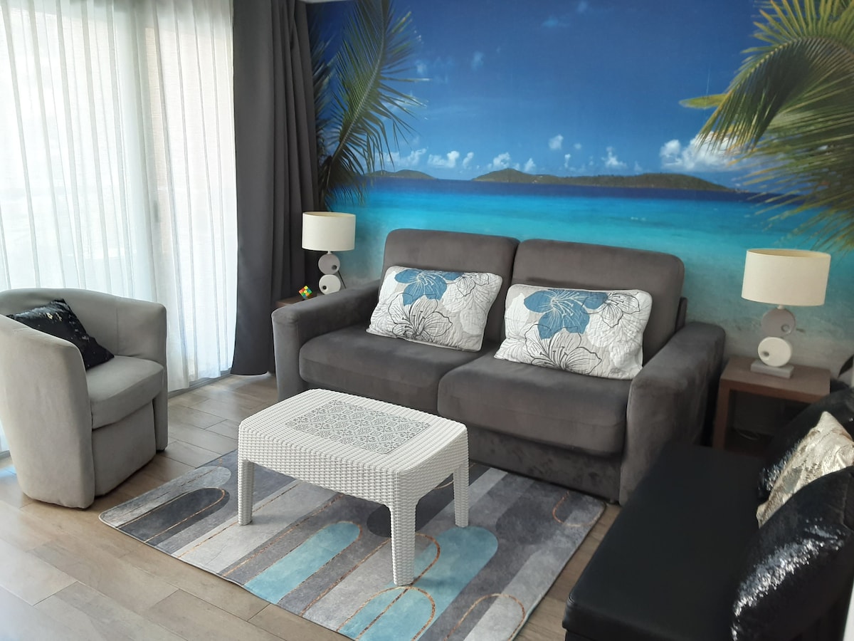 Apartamento con todas las comodidades con vistas a las piscinas. Ventajas: acceso a la playa a 50 m, piscinas, aire acondicionado central, terraza grande, cuna, 2 televisores, lavadora, secadora, estacionamiento privado en el sótano. Opción de ropa de cama bajo petición: suplemento de 20€ (sábanas, toallas, camas hechas) para toda la estancia. Ubicación ideal: ¡todo a pie! Lugares, restaurantes, transporte, tiendas (2 supermercados muy cerca). Cannes Centre a 3,5 km (10 minutos en automóvil, 45 minutos a pie).