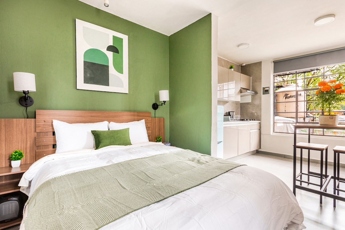 Vive una experiencia genuina en uno de los barrios más icónicos, llenos de riquezas culturales y sociales dentro la Ciudad de México. Sumérgete en un proyecto enfocado al arte; en donde diferentes artistas exponen su obra auténtica. Ubicado en el corazón de Roma-Condesa, a un par de cuadras de Amsterdam y Parque México, rodeado de boutiques, restaurantes, cafeterías, bares y otros lugares de interés. Enamórate de un espacio nuevo diseñado y amueblado pensando en tu comodidad con A/C