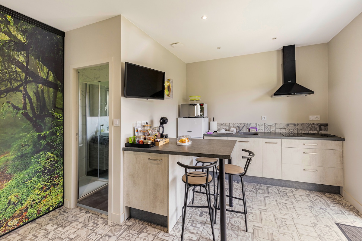 El alojamiento tiene 35 m2, totalmente nuevo en el recinto de un edificio industrial construido en la década de 1950 a 12 km de Le Puy du Fou en La Flocellière. El estudio está en nuestra casa con accesos independientes y el pasillo común. Es un lugar tranquilo y silencioso en el bosque de la Vendée. Tiene todas las comodidades necesarias para cocinar con la comodidad de un televisor, wifi y una mosquitera en la ventana.