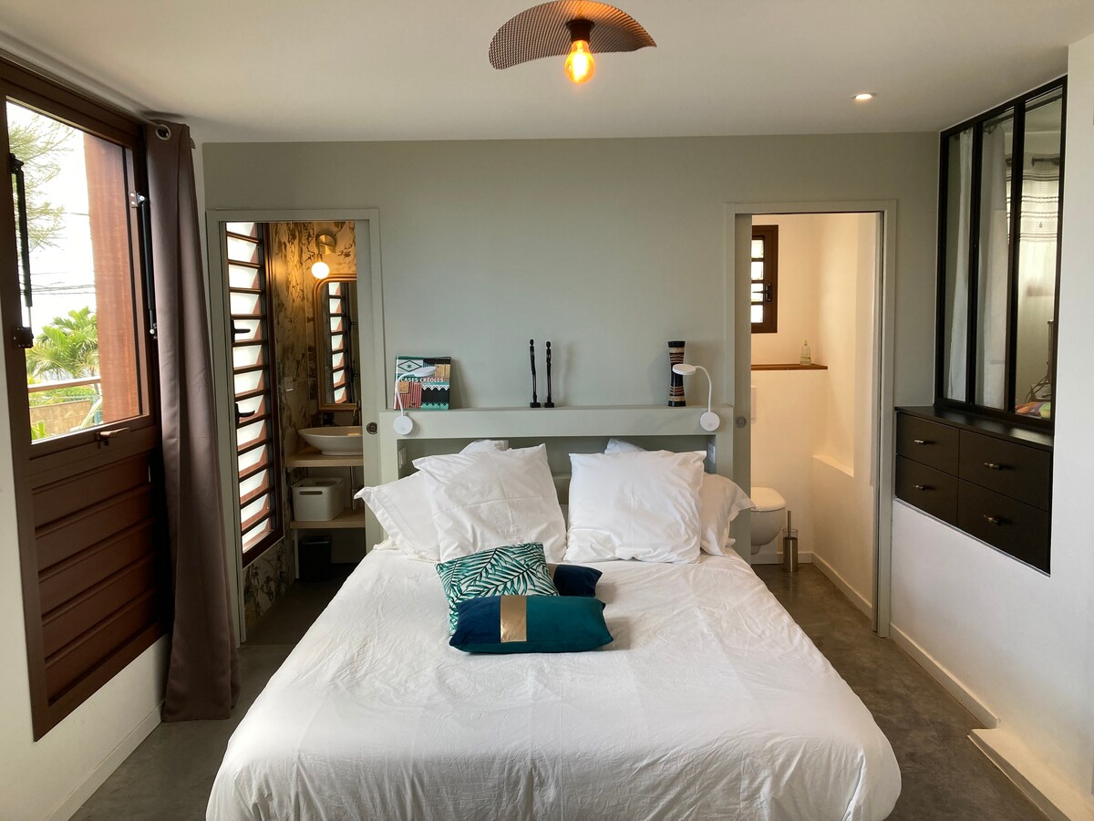 Es el alojamiento ideal para descansar entre dos excursiones, refrescarse y relajarse en la piscina a la sombra de los cocoteros, mientras disfruta de un clima más suave que en la costa, ya que estamos a 200 metros de altitud. Cómodo y espacioso, este alojamiento de 3 estrellas, en la planta baja de nuestra casa ofrece unas vistas maravillosas de la bahía de Saint Paul. Cuenta con una pequeña piscina de piedra natural, una terraza colgante y un jardín, todo para uso privado❤.