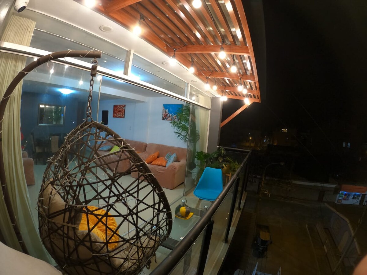 Hermoso lugar en 4to piso con acceso a terraza, a 100 m del océano. Un lugar céntrico, alegre y juvenil, ventilado e iluminado. Tiene un dormitorio con cama 2 plazas, sala comedor y cocina. Todo amoblado e implementado, sofá, TV, refrigerador, microondas, menaje de cocina. Ducha con agua caliente. lavadora compartida. Está cerca de los restaurantes, bodegas, farmacias, escuelas de surf, museo Chan Chan. Disfrute de paseos en el caballito de totora, deguste platos a base de pescados y mariscos.