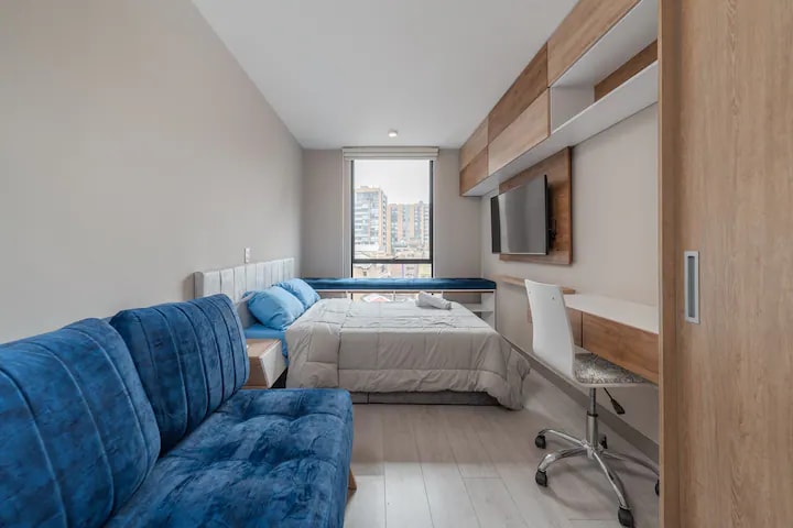 Recently renovated charming Studio. This place is strategically located: close to markets, museums, San Martin Mall, Monserrate, La Candelaria, La Plaza del Perseverancia, la Calle Bonita, National Park International Center (Financial zone), and countless restaurants, bars, and cultural activities that will make your visit to the city, an unforgettable experience. The building has a gym, coworking, pool area, and BBQ terrace on the top floor 360 View.