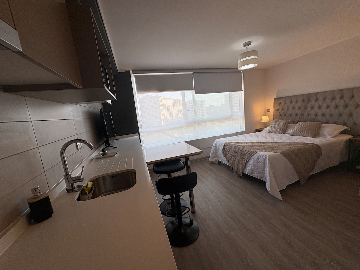 Luminoso, amplio y moderno . Ubicado en zona estratégica de Santiago de Chile, Providencia, una de las comunas con mejor calidad de vida. Polo de actividad comercial, con muchos atractivos históricos y patrimoniales. Excelente conexión de Transporte. A 3 cuadras del Mall Costanera Center y de la calle El Bosque, lugar de restaurantes, cafés y librerías. Design minimalista, cama King Size, Smart TV , Horno Microonda , Encimera y Horno Electrico, Aire Acondicionado Frio/Calor, amplio Sofa.