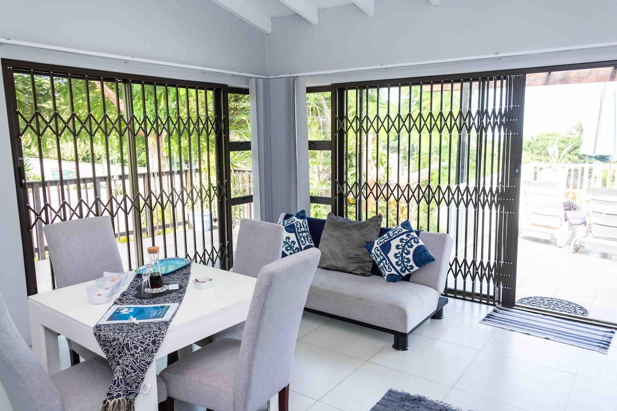 Modern self catering apartment with airconditioning. 15 min from King Shaka airport & shopping centres. 1 Bedroom with queen size bed. Open plan lounge, dining and kitchen. Dishwasher, full fridge/freezer, washing machine, microwave and stove. Lounge has foldaway glass doors opening up onto deck & garden with built in braai. Bathroom with bath & shower. Flat screen tv with full DSTV. Separate from main house with its own entrance & fully enclosed garden & garage. 900m from Salt Rock main beach.