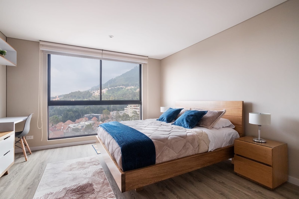 Stunning loft with breathtaking city & mountain views. Indulge in the most luxurious bed in the building, providing a level of comfort akin to a five-star hotel. Plush pillows ensuring the best sleep of your life. Enjoy a 60" TV with Netflix, a well-equipped kitchen, and relax in the easy chair by the window. Hot water shower, Hairdryer, ample closet space, and a perfect work area. Upcoming amenities: rooftop, coworking, gym. Close to Transmilenio station. Book now for an unforgettable stay