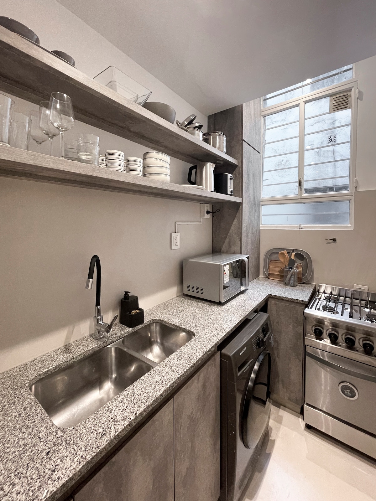 Hermoso monoambiente a estrenar ubicado en el barrio de Palermo.El apartamento tiene todas las comodidades para que disfrutes de una excelente estadía en Buenos Aires. Wifi , TV con cable 50 pulgadas , cama matrimonial, cocina totalmente equipada (horno eléctrico, microondas, tostadora, pava eléctrica, etc). El apartamento se encuentra en un piso 6 lo que permite tener luz durante todo el día.