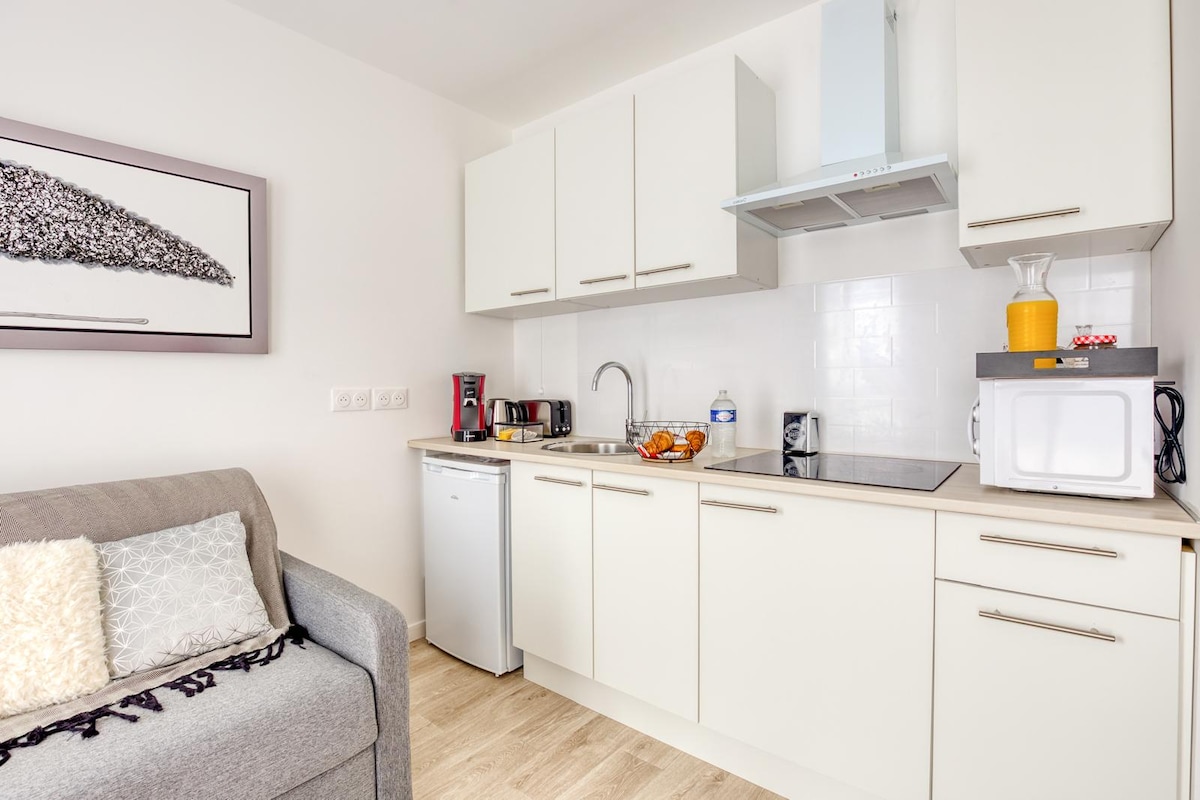Con vistas a nuestro impresionante patio interior y a la encantadora iglesia vecina, tu pied-à-terre ofrece vistas abiertas, luz natural increíble y tranquilidad absoluta, en el corazón de París. Cada departamento incluye una sala de estar con sofá cama, un comedor con una mesa redonda, un hermoso dormitorio con una cama de lujo de calidad hotelera, una cocina abierta totalmente equipada con lavavajillas y lavadora-secadora, un baño con ducha y un inodoro separado.