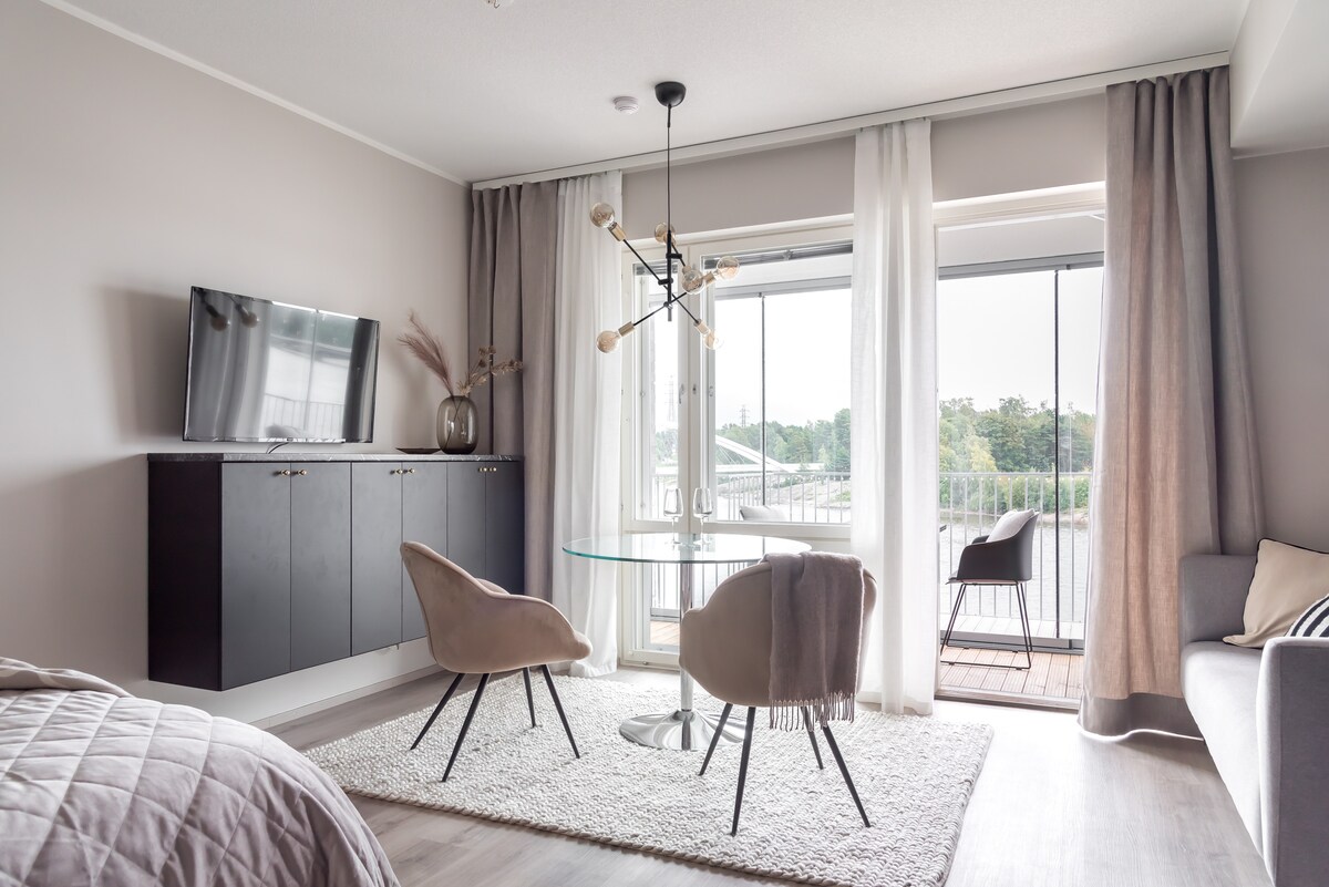 Disfruta de un estudio de lujo con vistas increíbles al mar en uno de los barrios más de moda de Helsinki. El interior fue perfeccionado por uno de los mejores diseñadores de interiores finlandeses, destacando los elementos nórdicos y creando la sensación de una habitación de hotel de lujo. Para tu comodidad, el apartamento cuenta con una cómoda cama tamaño queen, un televisor inteligente de pantalla plana para ver tu película favorita de Netflix, Internet inalámbrico rápido y un balcón cubierto de vidrio con impresionantes vistas al mar.