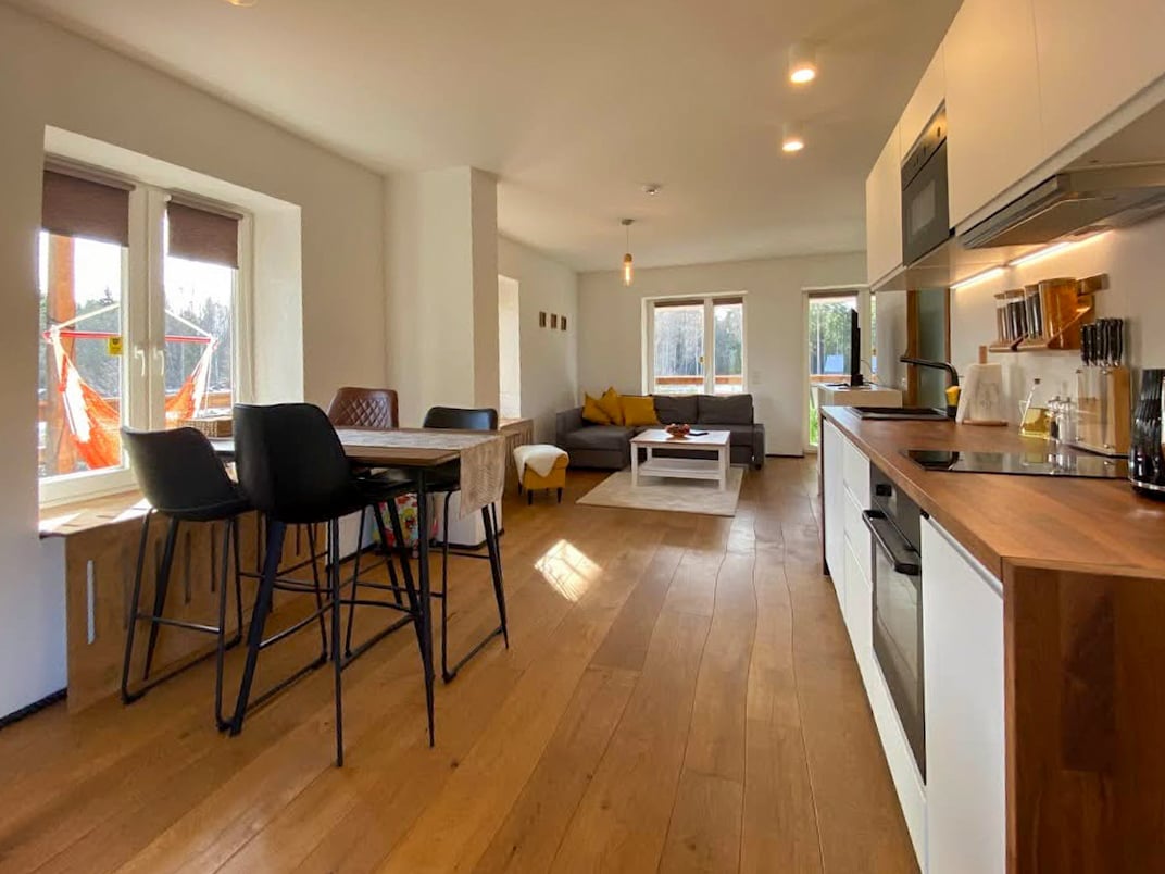 A bright Scandinavian-style apartment in the village of Kolga, right at the edge of Lahemaa National Park. This is a genuinely calm space, designed for people who want to slow down, walk in old-growth forest, visit Viru Bog at sunrise, or simply do nothing for a few days with no guilt attached. Minutes from the park entrance, with free parking, a fully equipped kitchen and a queen bed made up properly, it works equally well for couples, solo travellers and anyone arriving with a dog.