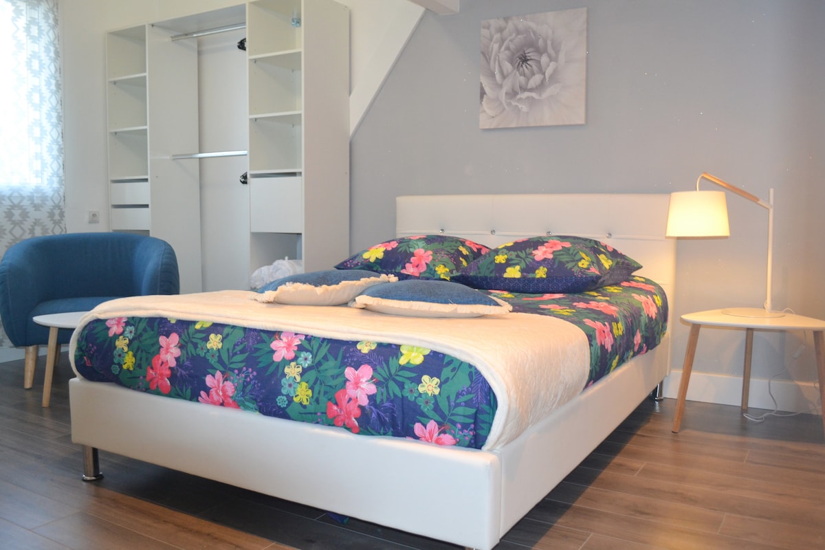 Hablamos inglés y chino con fluidez. 我们可以讲和写中文 Alojamiento tipo «estudio T2» con una parte de salón cocina en la planta baja y una parte de noche con baño en el 1er piso. Completamente nuevo en construcción y equipamiento Espacio de aparcamiento privado. Tranquilidad ambiental. 2 espacios acogedores, sala de estar y cocina totalmente equipada en la planta baja y dormitorio con baño en el primer piso. Completamente nuevo con jardín circundante en zona tranquila. Aparcamiento privado en las instalaciones.