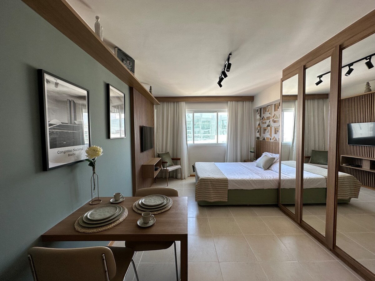 Piso de alta gama, ideal para el trabajo o el ocio, perfecto para estancias cortas o largas, con microondas, nevera, cubiertos, mesa, baño privado con ducha, secador de pelo y TV giratoria y cafetera. Excelente ubicación, junto a 3 de los principales centros comerciales de la ciudad y a 10 minutos de la Esplanada dos Ministérios. Instalaciones: Wi-Fi gratuito, Netflix, Globoplay, sauna, piscina, jacuzzi, gimnasio y las mejores vistas de Brasilia.