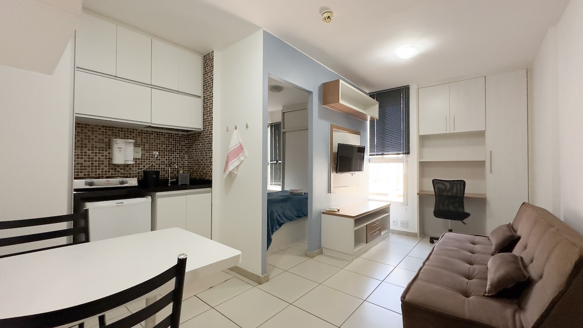 Kitnet en Asa Norte con Aire Acondicionado Tiene una excelente ubicación en un barrio noble cerca de todo; panadería, restaurantes, farmacia, lavandería, supermercados, centros comerciales y parque ecológico con dos manantiales. Unb y Ceub a 3 km. Esplanada de los Ministerios a 5 km. Cama Queen size con colchón de resortes embolsados individualmente estándar de hotel. Banda ancha Claro Cuenta con SmartTV de 43", minibar, microondas, filtro de agua fría Estacionamiento público disponible y parada de autobús a menos de 100 metros.