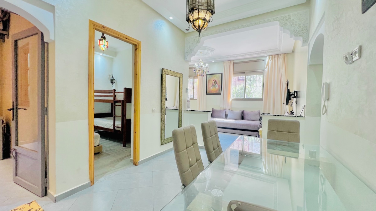 Descubre una mezcla única de diseño minimalista y tradición marroquí en este elegante apartamento de 2 dormitorios y 2 baños. Disfruta de un jacuzzi privado en la terraza, una cocina totalmente equipada y elegantes espacios de estar. Ubicado en una residencia segura con una piscina compartida, este espacio es perfecto para relajarse después de explorar Marrakech. Un refugio tranquilo y moderno con todas las comodidades que necesitas y un toque de alma marroquí.