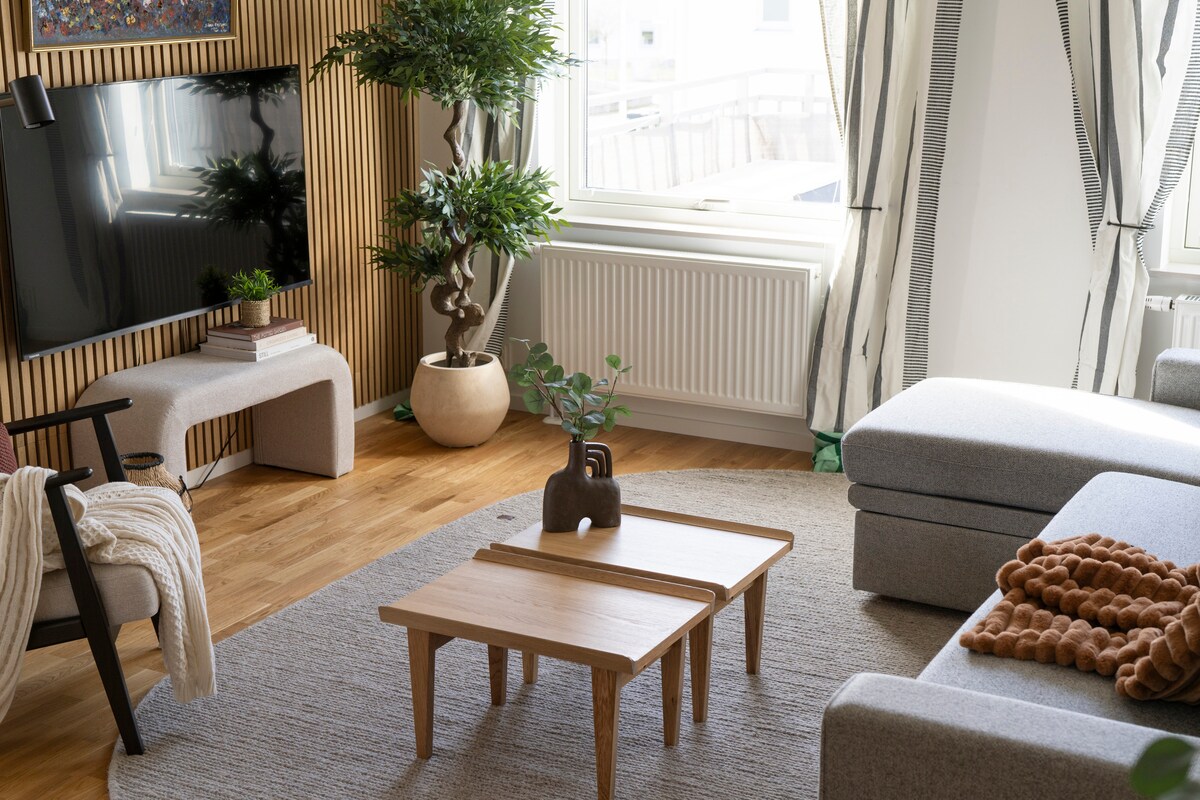 Vida prémium en un apartamento de diseño escandinavo de 1 dormitorio. Con el lujo de tu propia terraza privada con sol desde temprano por la mañana hasta temprano en la noche. Barbacoa incluida para que ambos puedan preparar y disfrutar de sus comidas al aire libre. Para relajarte tienes un paseo de 2 minutos hasta nuestra piscina climatizada y a 10 minutos del mar. Luego, ya sea que quieras ir al centro de comida y entretenimiento del puerto de Båstad o a la tranquila belleza del Jardín Botánico de Norrvikens, ambos están a solo 15 minutos a pie.