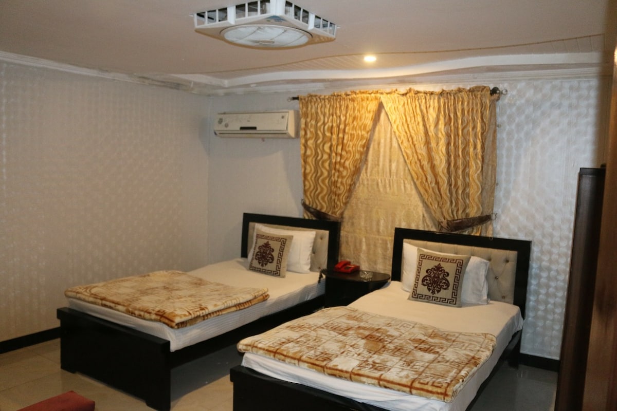 Ten en cuenta que, de acuerdo con las regulaciones de Pakistán, no se permiten parejas locales no casadas. La habitación doble en Oban Hotel ofrece un acogedor espacio de 16 metros cuadrados, perfecto para dos huéspedes. Cuenta con dos cómodas camas individuales, wifi de alta velocidad, aire acondicionado, minibar y escritorio. Los huéspedes también pueden disfrutar de servicio a la habitación las 24 horas, los 7 días de la semana, lavandería y desayuno de cortesía. Ubicado en Gulberg, Lahore, está cerca de tiendas y comedores populares, lo que garantiza una estancia conveniente.