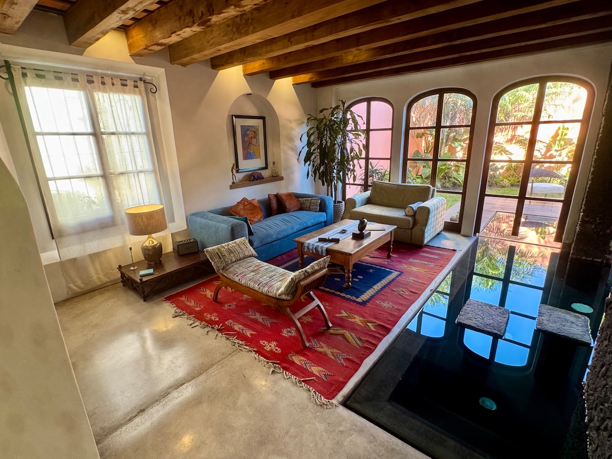 Sentirás como estuvieras en tu propio hotel boutique en este espacio donde el Viejo Mundo se encuentra con Brooklyn Cool. Paredes de 250 años sostienen techos de 17 pies que albergan muebles hechos a mano y obras de arte producidas por los mejores talentos emergentes de la región. Un precioso jardín rodea un jacuzzi al aire libre. La terraza cuenta con area de descanso para 30+ personas, con vistas de los famosos volcanes de Antigua. Aparcamiento gratuito incluido en un lote cerca de la casa.