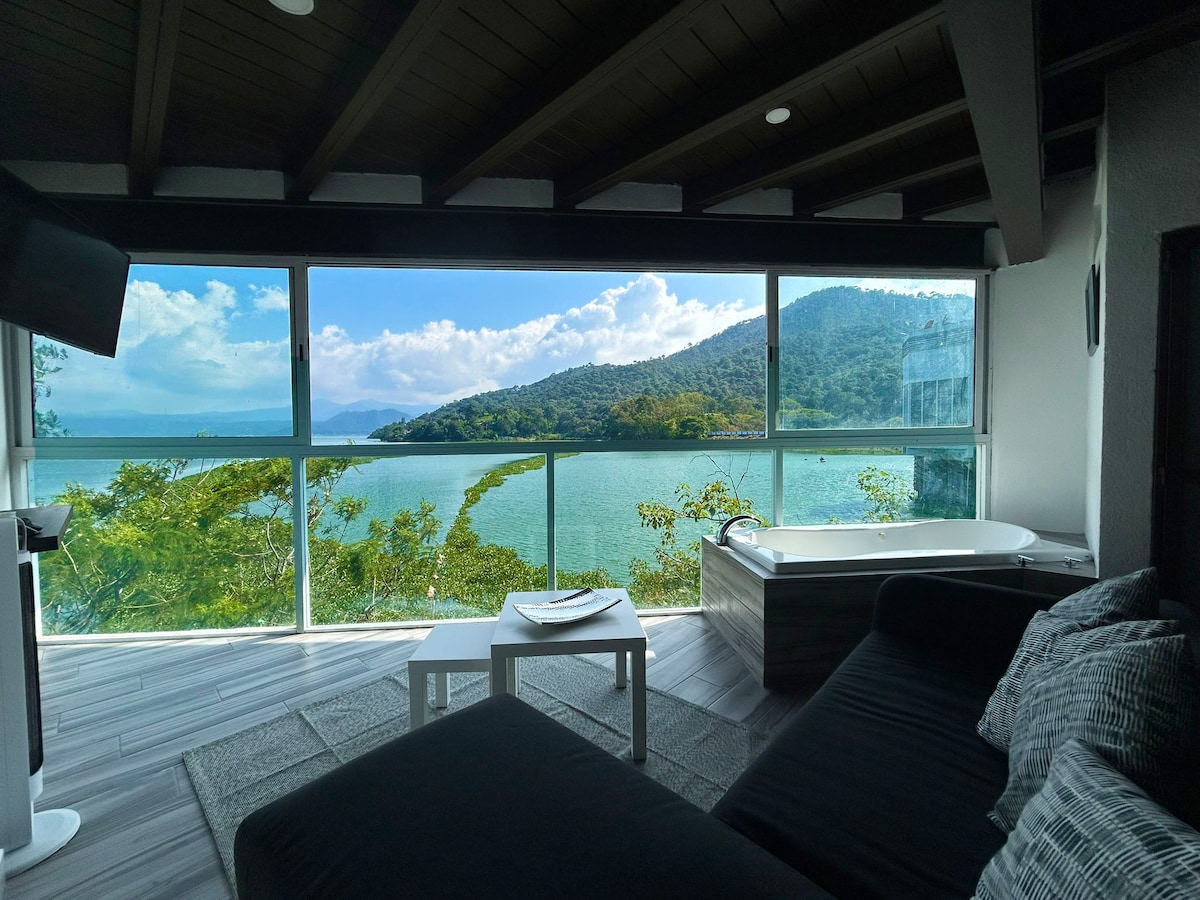 Vive una experiencia única en nuestro cantiléver suspendido sobre el lago. Este loft de dos pisos te sumerge en el paisaje a través de sus imponentes ventanales de doble altura. Disfruta de la recámara con cama king, la terraza amueblada y el exclusivo jacuzzi panorámico que parece fundirse con el horizonte. Un refugio de arquitectura audaz donde cada amanecer se convierte en un espectáculo privado. Tu escape perfecto en Valle de Bravo.