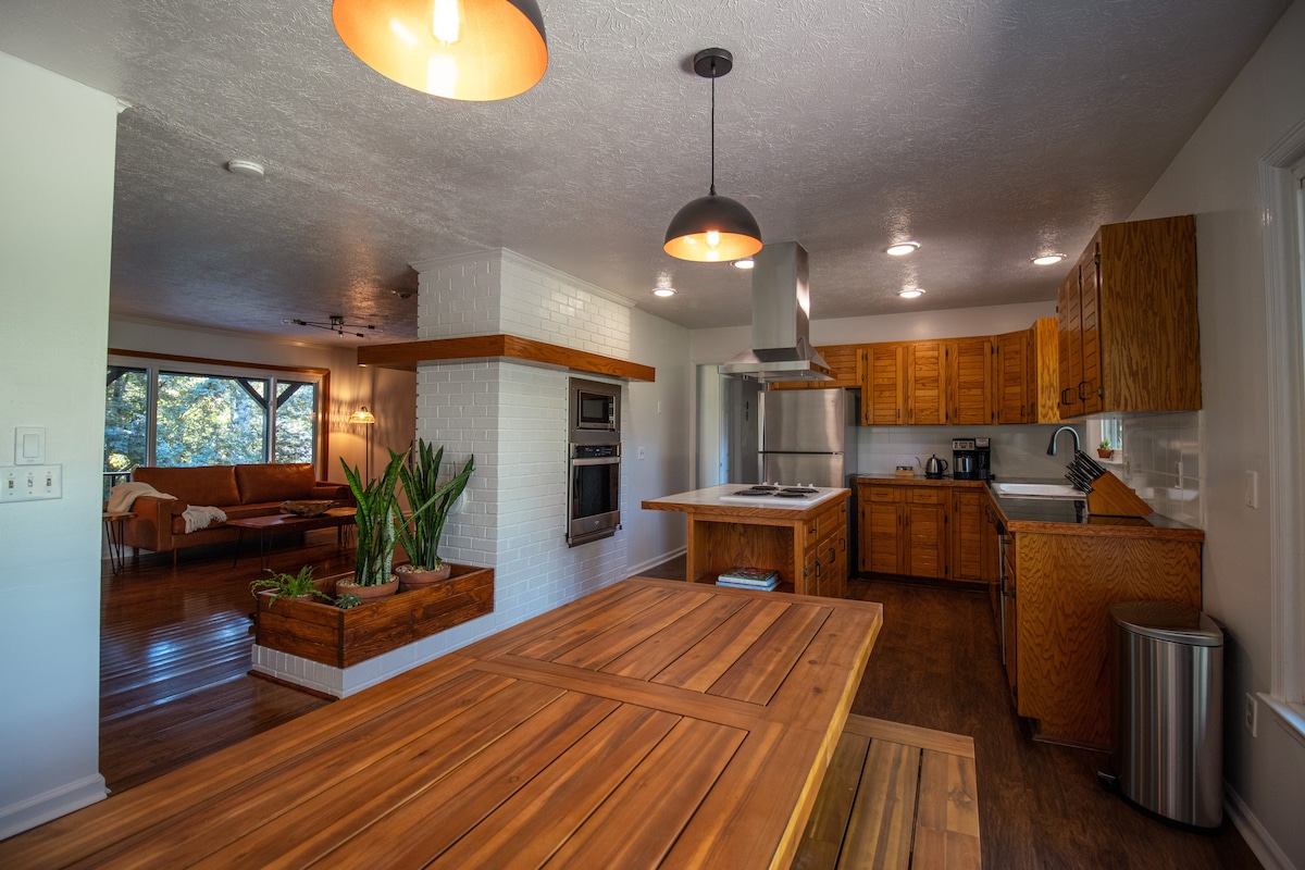 The Bluff Haus is a chalet-style getaway in the Blue Ridge Mountains. Two decks overlook a lush forest – and are the stuff of Appalachian dreams. From an outdoor living room to a hot tub and glowing string lights, our decks are a vacation destination unto themselves. Inside, this new house inspires and comforts you across two floors with a farmhouse vibe, tons of amenities, free EV charging, and large windows with endless tree views.