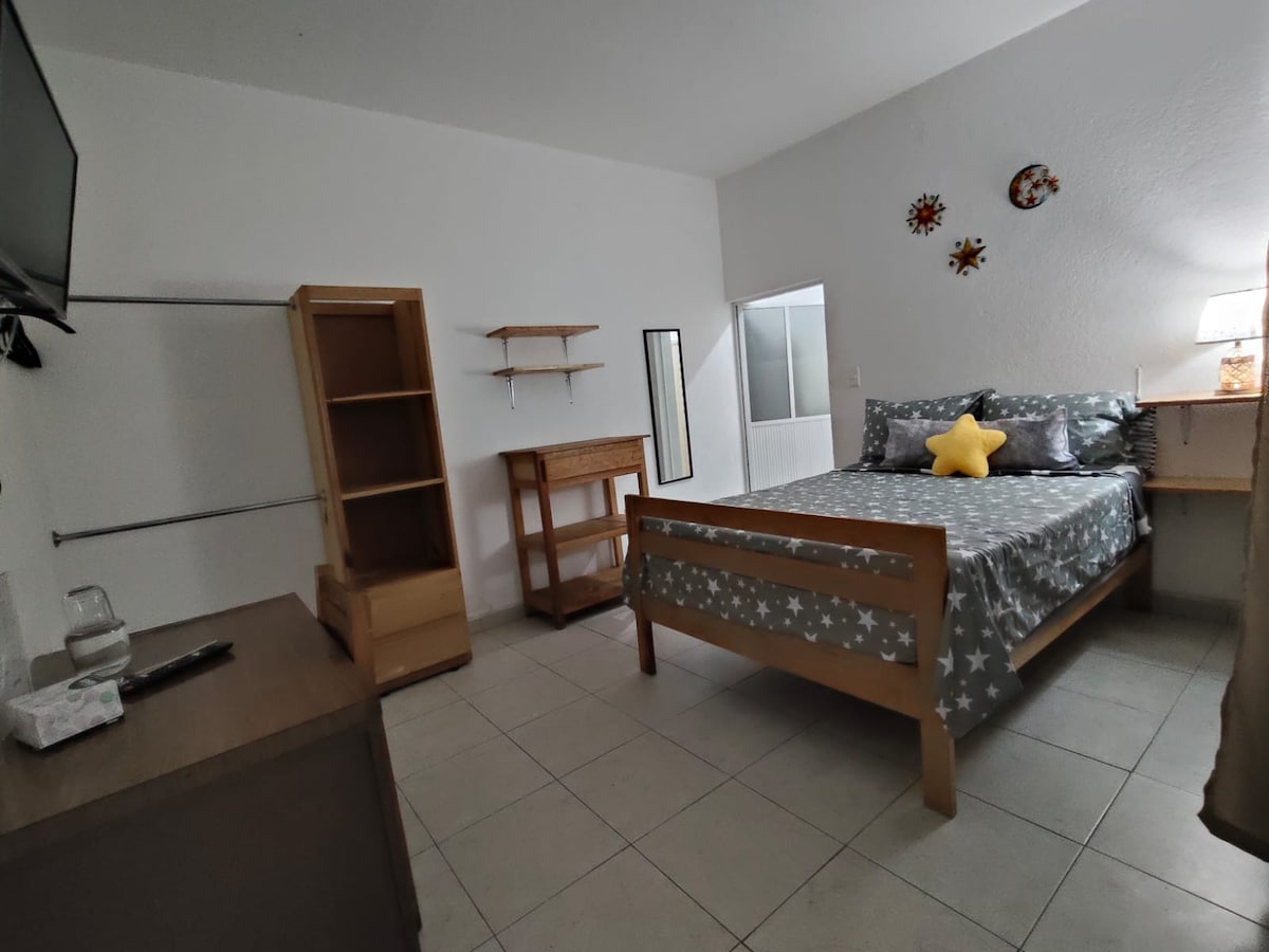 Ofrecemos una encantadora casita estudio. Tiene una entrada privada. La casita está situada dentro de una casa ubicada en una gran comunidad cerrada a las afueras de la ciudad de Chapala. Es acogedor, tranquilo y limpio con baño privado y cocina. En la cocina: hay un pequeño refrigerador, cafetera, microondas y horno tostador.
