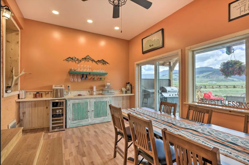 La cabaña principal tiene aproximadamente 1900 pies cuadrados con 4 dormitorios y 4 baños que son privados para cada habitación. Hay una cocina principal y sala de estar con chimenea de leña y estufa de leña. También hay otra habitación con una pequeña cocina. La adición en la parte trasera de la cabaña es un anuncio separado de Airbnb, pero también puede estar disponible. Esta adición es de 420 pies cuadrados. Con cocina, baño, cama tamaño king y cama individual. La cabaña está frente al centro de visitantes y de la oficina de correos en el extremo norte de la ciudad.