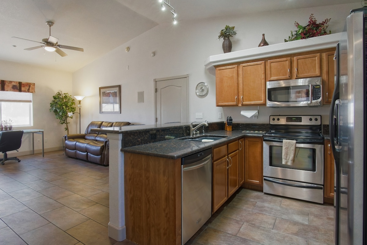 ¡Bienvenido a este bonito apartamento de 1 dormitorio en el precioso lago Havasu! Apartamento privado con suite principal, baño de gran tamaño con tocador doble, combinación de bañera/ducha y vestidor. Sofá cama en el salón para más huéspedes. Planta abierta, chimenea, comedor, patio y lavadora secadora. Hogar inteligente con entrada sin llave, wifi y televisores inteligentes que te permiten ver tus servicios de streaming favoritos. Servicios comunitarios: piscina climatizada/spa, casa club para entretenimiento y sala de fitness. ¡Cerca del lago, tiendas y restaurantes!