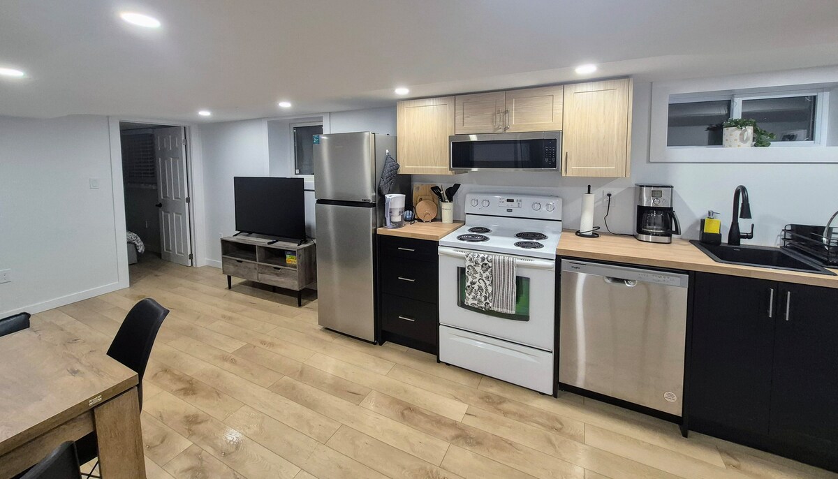 Esta es una moderna unidad renovada para no fumadores de 3 dormitorios (2 camas tamaño queen y 2 camas individuales). El espacio fue renovado y amueblado pensando en el huésped de Airbnb. Suelos de azulejos y laminados en todas partes. Todo estaba nuevo y limpio, incluyendo una cocina y baño nuevos. Bonita sala de estar con televisor grande de pantalla plana, Netflix y WIFI de alta velocidad GRATUITO . Cocina completa con todo el equipo necesario. Dos lugares de estacionamiento. Hay lámparas de mesa con puertos de carga inalámbricos y de teléfono por cable.