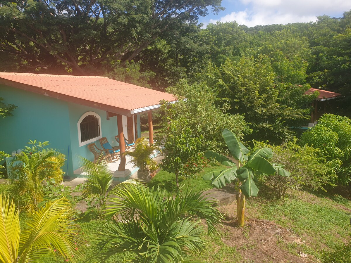 Our two guesthouses are situated in a quiet location, off the road to Playa Maderas, on a hilltop among the trees. Each house is designed for two people, who may bring one or two friends or children. The proximity to the beaches of Marsella (800m), Maderas (1.3km), and Majagual (2.3km) offers plenty of leisure and relaxation opportunities. Enjoy surfing, swimming, horseback riding, or simply unwind. Shopping facilities are available. We can arrange a cheap, private rental car.