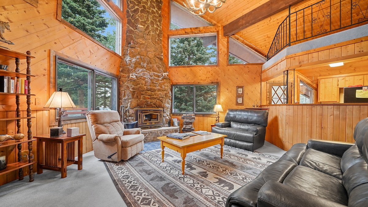 The main lodge is approximately 1900 square feet with 4 bedrooms and 4 baths which are private to each room. There is a main kitchen and living area with wood burning fireplace and woodstove. There is also another room with a small full kitchen. The addition on the back of the lodge is a separate Airbnb listing but may also be available. This addition is 420 sq ft. With a kitchen, bath, king and a twin bed. Cabin is across from visitor center and post office at north end of Town.