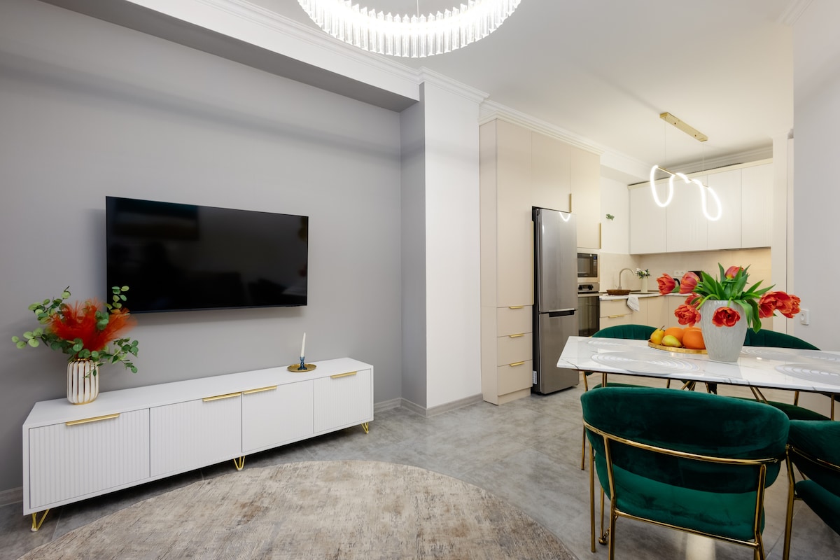 Add my listing to your wishlist by clicking the ♥ in the upper-right corner: ◦ 24/7 Self Checkin ◦ New Building with a Premium Reception ◦ 48 sqm ◦ 3/9 floor ◦ Lift ◦ Balcony /w outdoor Furniture ◦ Central heating/cooling system ☆ Designer Made And Furnished ◦ Premium Amenities ◦ Smart TV ◦ Fast WIFI ◦ Fully equipped + Stocked kitchen ◦ Sofa+Bed ◦ Pool/ sauna in the building (paid) ◦ Fresh Linens and towels ◦ Starter Luxury Hotel Toiletries