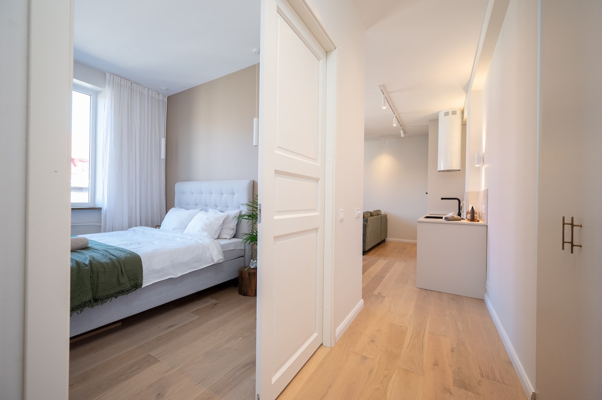 El espacioso (60 m2) y moderno, pero acogedor estudio (= apartamento de planta abierta) te espera en una ubicación perfecta, a poca distancia a pie de todo lo que el centro de la ciudad de Tallin tiene para ofrecer, ¡incluido el casco antiguo medieval! El departamento cuenta con cocina totalmente equipada y baño con jacuzzi. Estacionamiento gratuito disponible en el patio cerrado. Hay una parada de transporte público y una parada de taxis a 200 metros. Perfecto para parejas, amigos y familias, pero también para aventureros solitarios. Listo para viajeros de negocios.