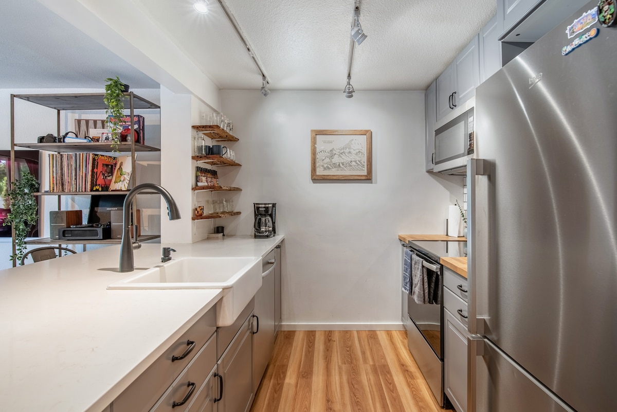 Mantente caliente junto al fuego, ya sea en los asientos incorporados alrededor de la hoguera o en el interior, en el sofá modular junto a la chimenea de gas lineal debajo del marco de TV Samsung. También en el interior hay ventanas del suelo al techo, calefacción por suelo radiante y detalles de vigas a la vista. El apartamento cuenta con una impresionante sala de estar de planta abierta con una cocina bien equipada, además de dos baños con una lujosa ducha de efecto lluvia.