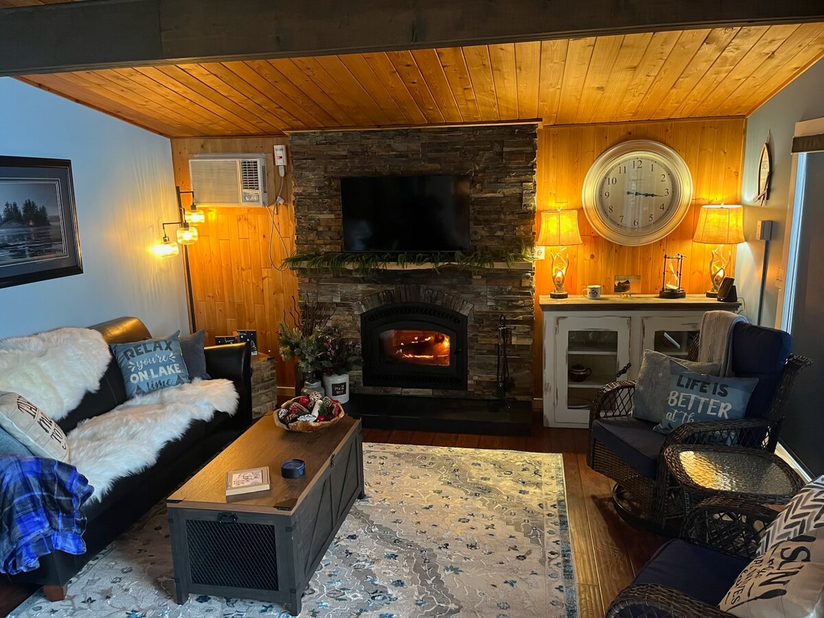Reservación para INVIERNO / PRIMAVERA/VERANO/OTOÑO 2026 Trae a toda la familia a esta gran cabaña frente al lago totalmente renovada para las 4 estaciones. Disfruta de motos de nieve, patinaje (tendrás que palear), raquetas de nieve, esquí de fondo, pesca en hielo y caminatas de invierno. Natación de verano, playa, kayak, tardes tranquilas. 5 dormitorios, 8 camas tamaño queen, 2 baños completos, lavadora/secadora. Cocina funcional abierta/asientos en la isla =4 . Mesa de comedor interior = 10. Comedor en la terraza = 10+. *** LAS RESERVACIONES DE FIN DE SEMANA LARGO SON MÍNIMO 3 NOCHES***