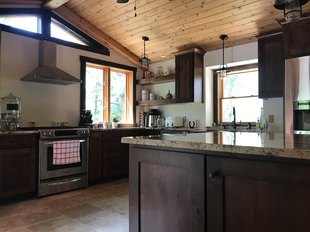 En lo alto de los majestuosos brazos de un roble blanco Burr de 150 años. Esta acogedora casa de siete habitaciones y 1200 pies cuadrados no solo tiene unas vistas impresionantes, sino que también tiene encantadoras y deliciosas sorpresas propias de un cuento de hadas. Sube 40 pies hasta la torre de observación, donde te espera un telescopio, listo para escanear el cielo nocturno y revelar el panorama de los cielos, con vistas a 500 acres de esplendor natural justo al lado. Sumérgete en los chorros calientes y burbujeantes del jacuzzi o en la cálida caricia de la ducha de efecto lluvia y restaura tu espíritu aliviando tus músculos y derritiendo cualquier tensión residual del día. Disfruta de un sueño reparador en una de nuestras suaves camas. Por la mañana, camina por los suelos radiantes (tan acogedores durante el invierno). O disfruta del café por la mañana en una de las cuatro cubiertas exteriores. Y no te olvides de resolver el misterio de la casa del árbol, que espera a que la descubras dentro de sus paredes de vigas de madera. Esta casa del árbol fue diseñada a medida por su arquitecto con un ajedrez tridimensional en mente. Los detalles arquitectónicos artesanales se encuentran en todas partes. Los candelabros de cristal adornan sus techos altos y las encimeras de mármol adornan la elegante cocina totalmente equipada. (Un sistema de sonido envolvente ayuda a crear el ambiente para esas cenas especiales en el rincón del comedor). Una de las dos chimeneas añade toques de lujo al dormitorio principal con una cama tamaño queen y una cama plegable en la habitación secreta, junto con un jacuzzi y una ducha de efecto lluvia en el baño principal, así como un segundo baño en la habitación secreta. Perfecto para recién casados, parejas, pernoctaciones de negocios/corporativas, viajeros solos y familias con niños mayores de doce años. Estos son solo algunos de los muchos detalles de lujo en este espectacular lugar de vacaciones que no te puedes perder. Pasa tus días acurrucado junto a la chimenea de tu elección, mientras disfrutas de las vistas panorámicas. Puedes transmitir tus películas y programas favoritos con wifi de banda ancha en toda la casa. Baja a dar un paseo tranquilo por los terrenos y pasa por visitar y alimentar a las cabras y pollos que llaman a Hope Glen Farm su hogar en el corral de esta histórica granja. Reduzca sus niveles de estrés y su ritmo cardíaco caminando hasta la Reserva del Parque Cottage Grove del Condado de Washington, a solo unos pasos, y responda a su llamada para explorar más de 550 acres de campos y bosques. Haz senderismo y ciclismo por sus senderos, busca tesoros escondidos en las colinas y barrancos o pasa la tarde pescando y haciendo kayak en los lagos. ¡Y no dejes que las temperaturas más frías te impidan descubrir la belleza natural prístina del invierno! Las actividades de invierno incluyen esquí de fondo y raquetas de nieve sobre las mantas de nieve. Respira profundamente el fresco aire invernal de Minnesota, verdaderamente uno de los grandes placeres de la vida. Además, a solo diez minutos en coche se encuentra el cercano Afton Alps en el parque estatal Afton, que ofrece esquí alpino y snowboard. Para mayor claridad, la casa del árbol tiene 2 dormitorios privados: El dormitorio 1 tiene una cama tamaño queen. El dormitorio 2 tiene un dormitorio con sofá cama estándar con medio baño adjunto, que es la habitación secreta que hay que encontrar. Regálate esta lujosa y encantadora suite TreeHouse en las copas de los árboles, para vivir una experiencia vacacional encantadora que nunca olvidarás. ¡Algo de lo que escribir a casa!