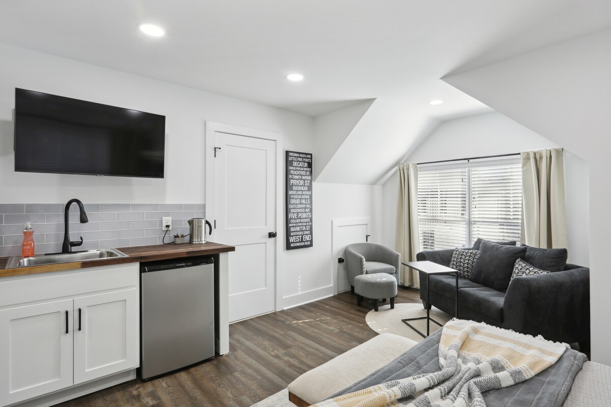Unwind and relax in this cozy and renovated guest home with full amenities. Located less than 10 minute walk from East Atlanta Village and various restaurants, bars and entertainment so no Uber is necessary. Moreover, the home is only a 10 minute drive from Downtown ATL. This is a one bedroom/one bath studio-like with full kitchen and dining space. Your stay comes along with a fire pit, smart TV, and study space. Parking is on site big enough for two cars. Enjoy time in ATL w/ your family.