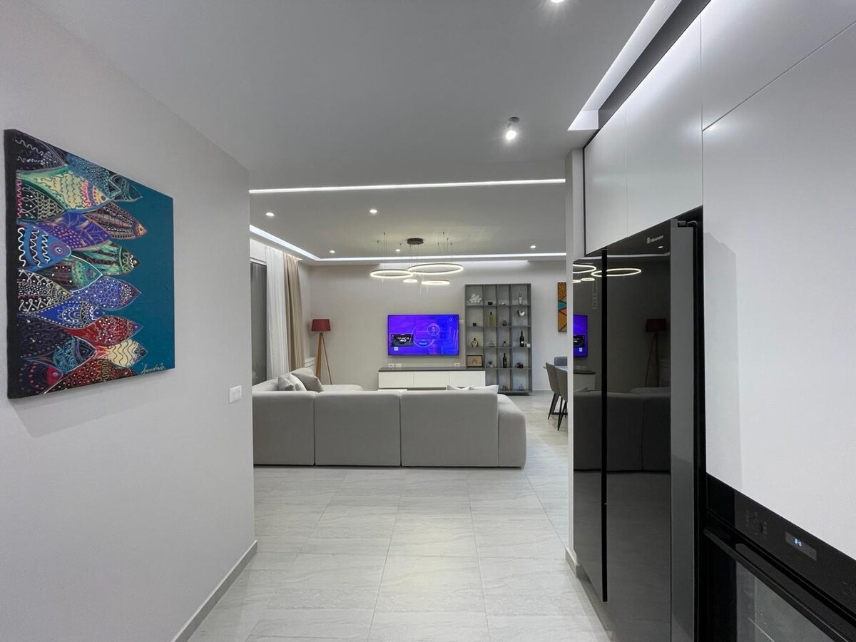 Enjoy a modern apartment by the seaside, featuring 2 bedrooms, 1 bathroom, a full kitchen, a balcony, a garden, a pool, a smart TV, air conditioning, and Wi-Fi. Relax in a quiet coastal area of Gjiri i Lalzit, Perla Resort, just 2 minutes walk to the beach and near restaurants. Perfect for families and friends seeking a scenic getaway with amazing views, private parking, and a pool. Book now for an unforgettable seaside stay!