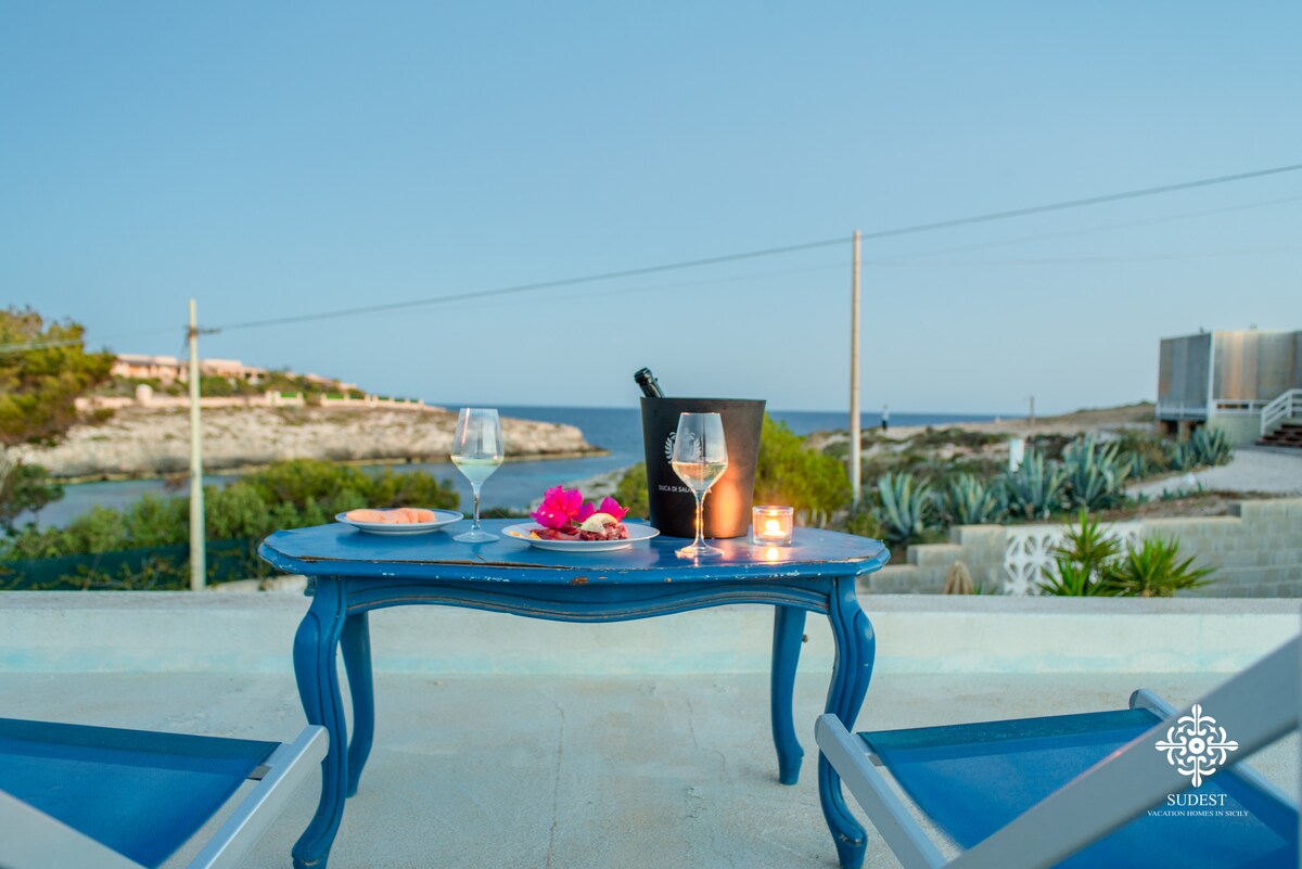 Case a Levante ofrece vistas espectaculares de la bahía de Cala Creta. Desde la casa se puede disfrutar de una vista espectacular del mar azul de Cala Creta y el faro de Grecale. Estacionamiento en la entrada. Tranquilidad absoluta. La ubicación está a unos cientos de metros del aeropuerto y del supermercado. El pueblo está muy cerca. Al salir de la puerta del patio con vistas al mar, a 30 metros de distancia, se encuentra la roca plana equipada de Cala Creta con bar con vistas al mar para disfrutar de excelentes desayunos.